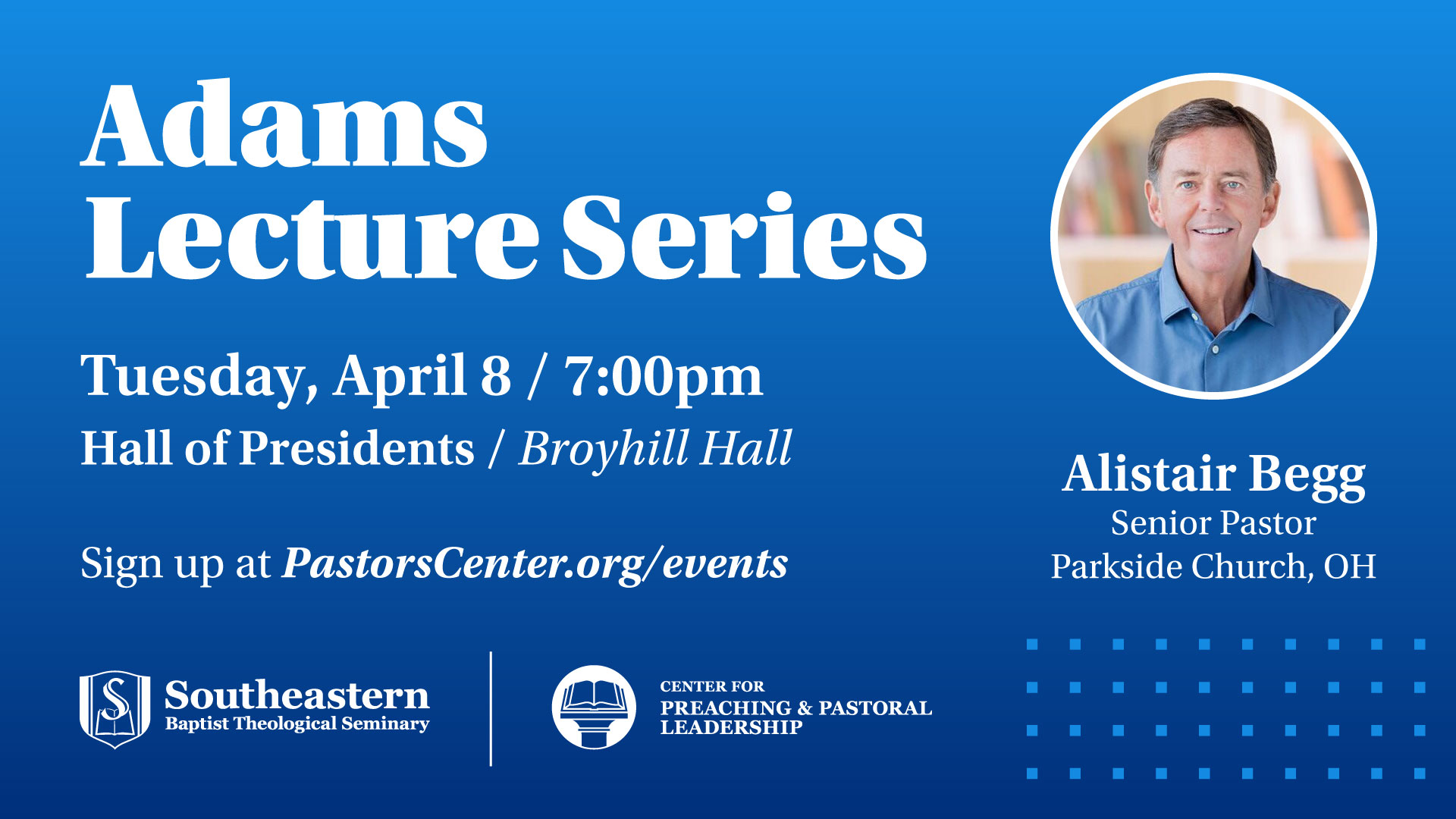 Join us in the Broyhill Hall of Presidents on April 8, 2025, from 7:00 to 8:30pm for the Adams Lecture Series with Alistair Begg, Truth for Life radio host and senior pastor of Parkside Church in Ohio.