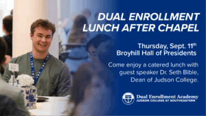 Are you a Dual Enrollment student at Judson College? Join us to enjoy a catered lunch with other dual enrollment students and hear from our special guest speaker, Dr. Bible, Dean of Judson College!