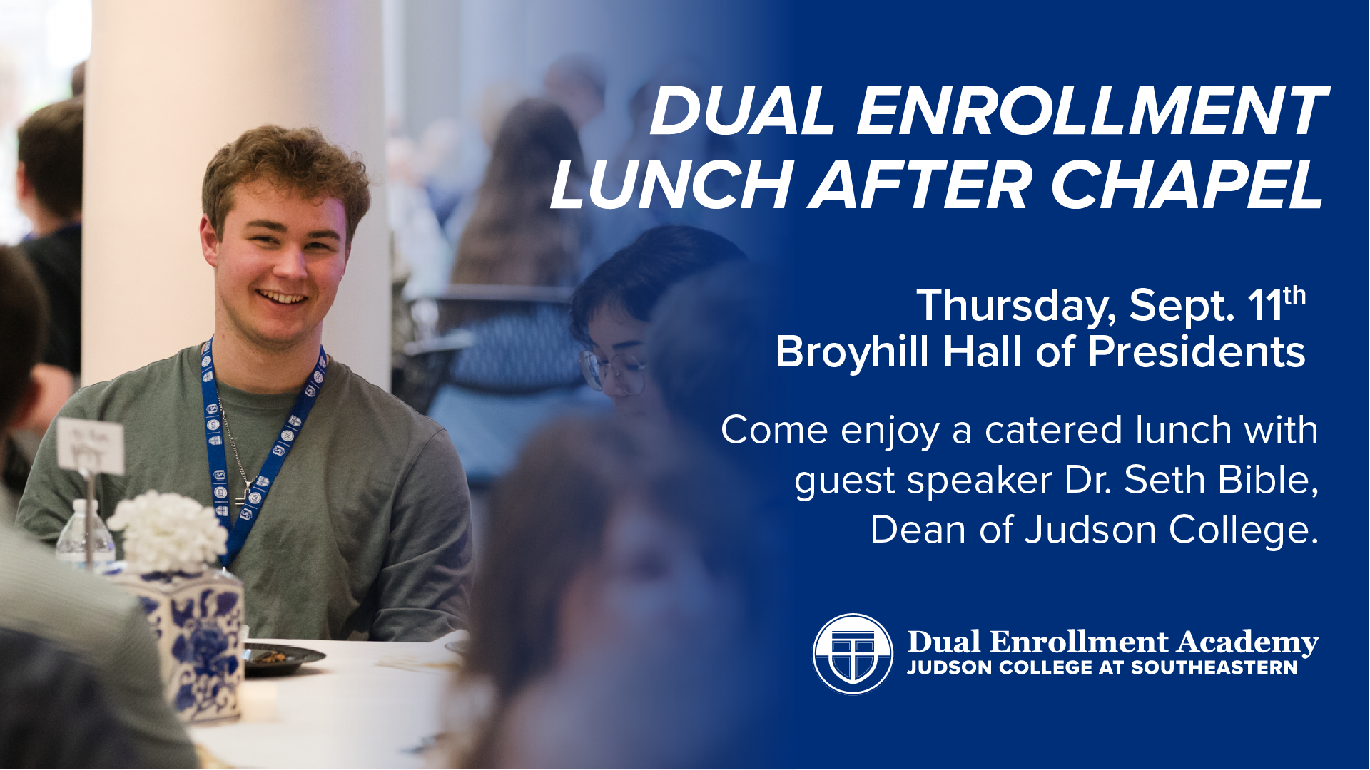 Are you a Dual Enrollment student at Judson College? Join us to enjoy a catered lunch with other dual enrollment students and hear from our special guest speaker, Dr. Bible, Dean of Judson College!