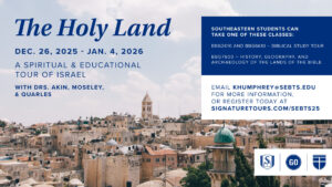 Southeastern is excited to resume its biennial tour of Israel where students, staff, faculty, and friends of the seminary will experience firsthand the sites of the land where the prophets preached and Jesus walked. On the tour, participants will learn about the biblical, historical, and archaeological significance of key locations and will hear relevant lectures by President Danny Akin; Allan Moseley, senior professor of Old Testament and Hebrew; and Chuck Quarles, research professor of New Testament and biblical theology.