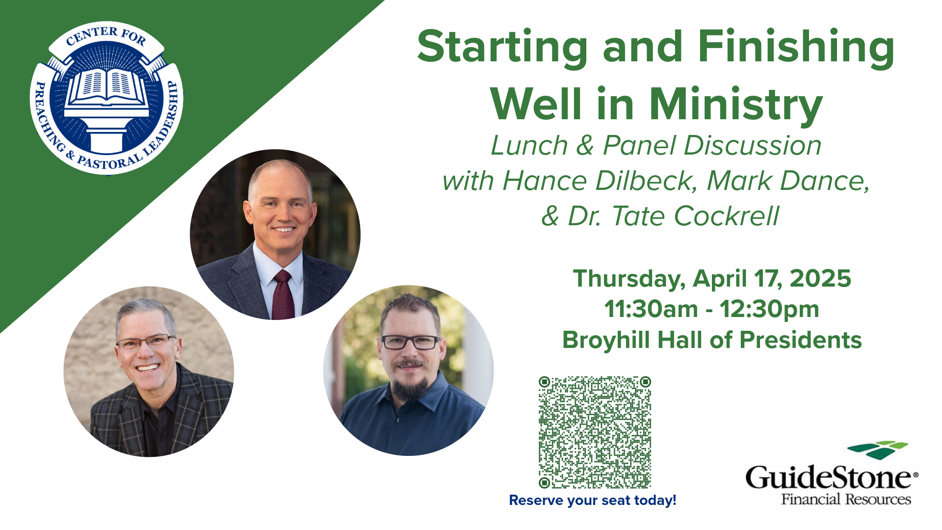 Join the Pastors’ Center team for this lunch and panel discussion with Hance Dilbeck, Mark Dance, and Dr. Tate Cockrell on “Starting and Finishing Well in Ministry” following chapel on April 17th.