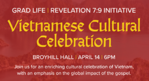Join us for a Vietnamese Cultural Celebration where we introduce the richness of Vietnamese culture while highlighting religion and Christianity in Vietnam. Guests will have the opportunity to experience elements of Vietnamese culture through traditional food, cultural presentations, personal stories and faith journeys of Vietnamese believers, and activities that reflect the culture. The evening will also include a missional focus, sharing how God is at work among Vietnamese people and how students, churches, and ministry leaders can participate in that mission. Whether you are interested in cross-cultural ministry, curious about Vietnamese culture, or simply looking to connect with the international community at Southeastern, this event will be a meaningful time of learning, fellowship, and encouragement. All students, staff, and faculty members are welcome to attend.